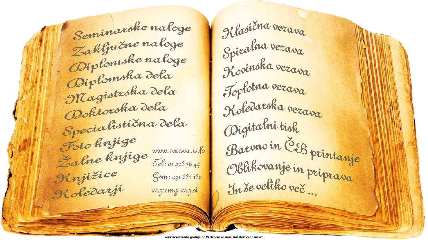 BARVNO in ČB printanje Oblikovanje in priprava Koledarska vezava (od 15 do 30,5 cm) In še veliko, veliko več .... Digitalni TISK Toplotna - TERMO vezava Spiralna kovinska vezava Spiralna plastična vezava Klasična vezava Akcije in popusti - KUPONČKI www.VEZAVA.info Ugodno in zanesljivo gostovanje PIŠITE NAM Splošne informacije o nas in kje smo Koledarji KNJIŽICE ŽALNE knjige FOTO knjige Specialistične naloge in dela Doktorska dela Magistrska dela Diplomska dela Diplomske naloge Zaključne naloge Seminarske naloge